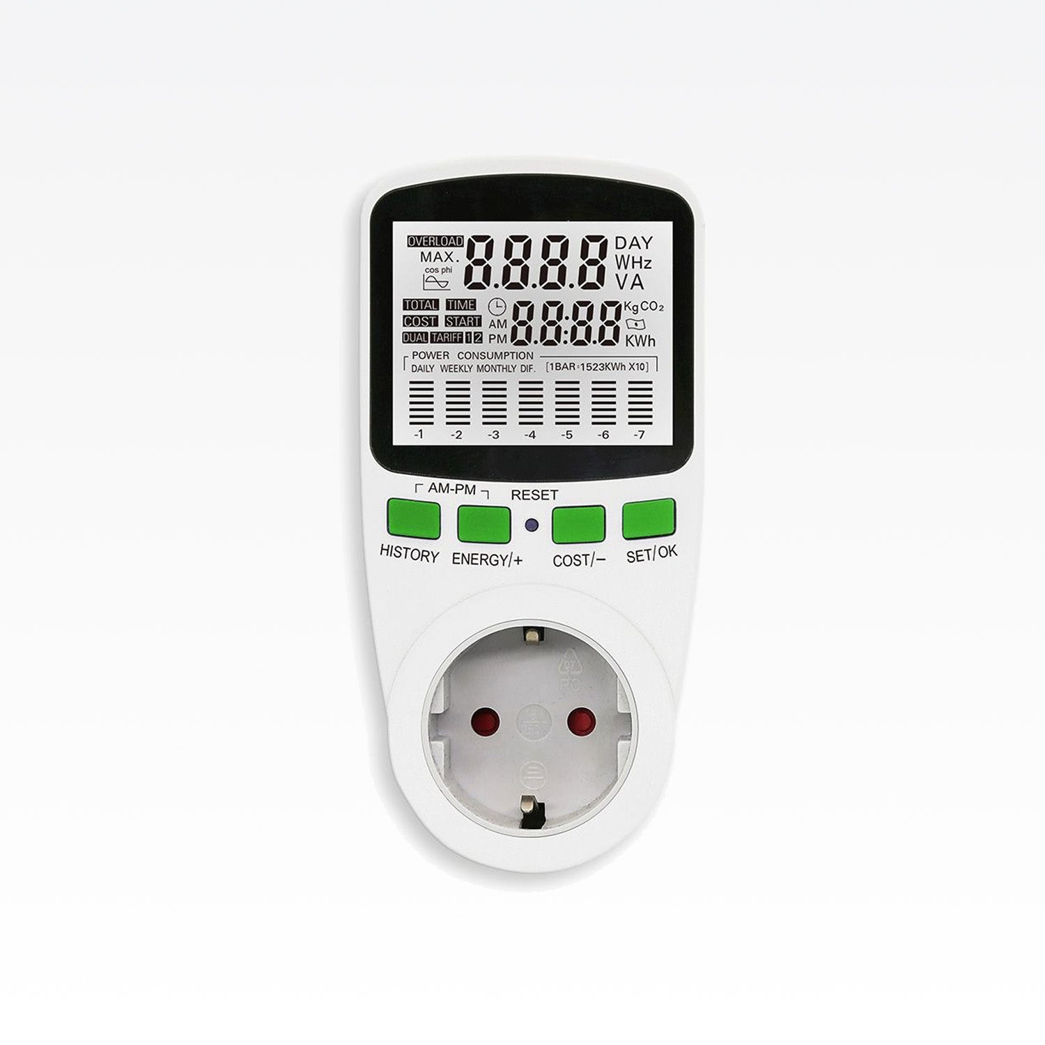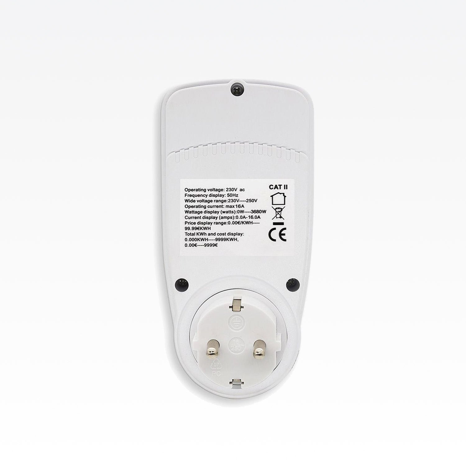 Mit kompakten Maßen von 150×75×35 mm fügt sich der Zähler dezent in jede Steckdose ein. Das grüne Backlight sorgt für optimale Ablesbarkeit, die Bedienung ist unkompliziert. Hinweis: Nur für den Innenbereich und trockene Umgebungen geeignet.